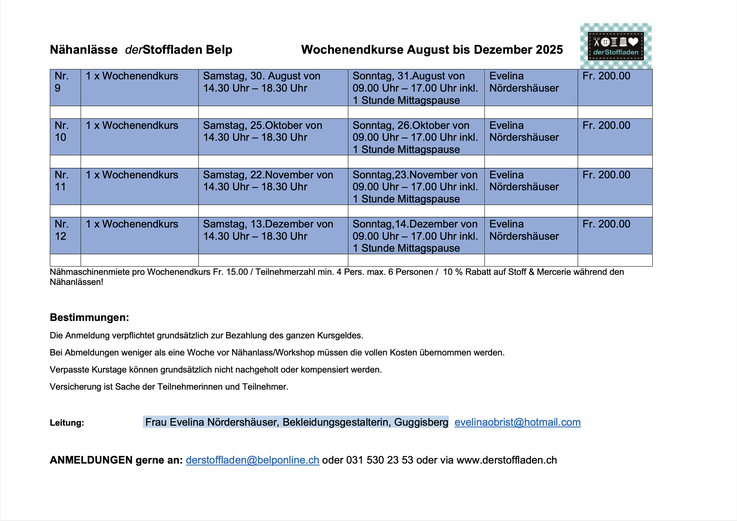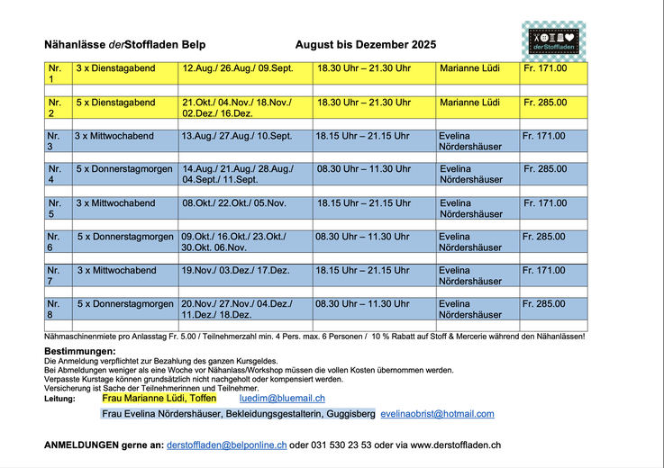 Ø Muss ein Nähanlass/Workshop mangels Anmeldungen abgesagt werden, erfahren das die Angemeldeten spätestens eine Woche vor Kursbeginn.